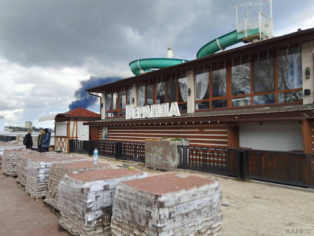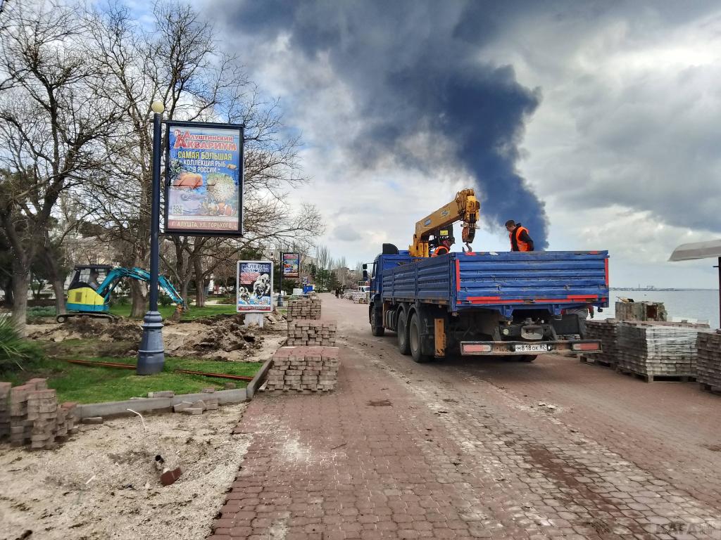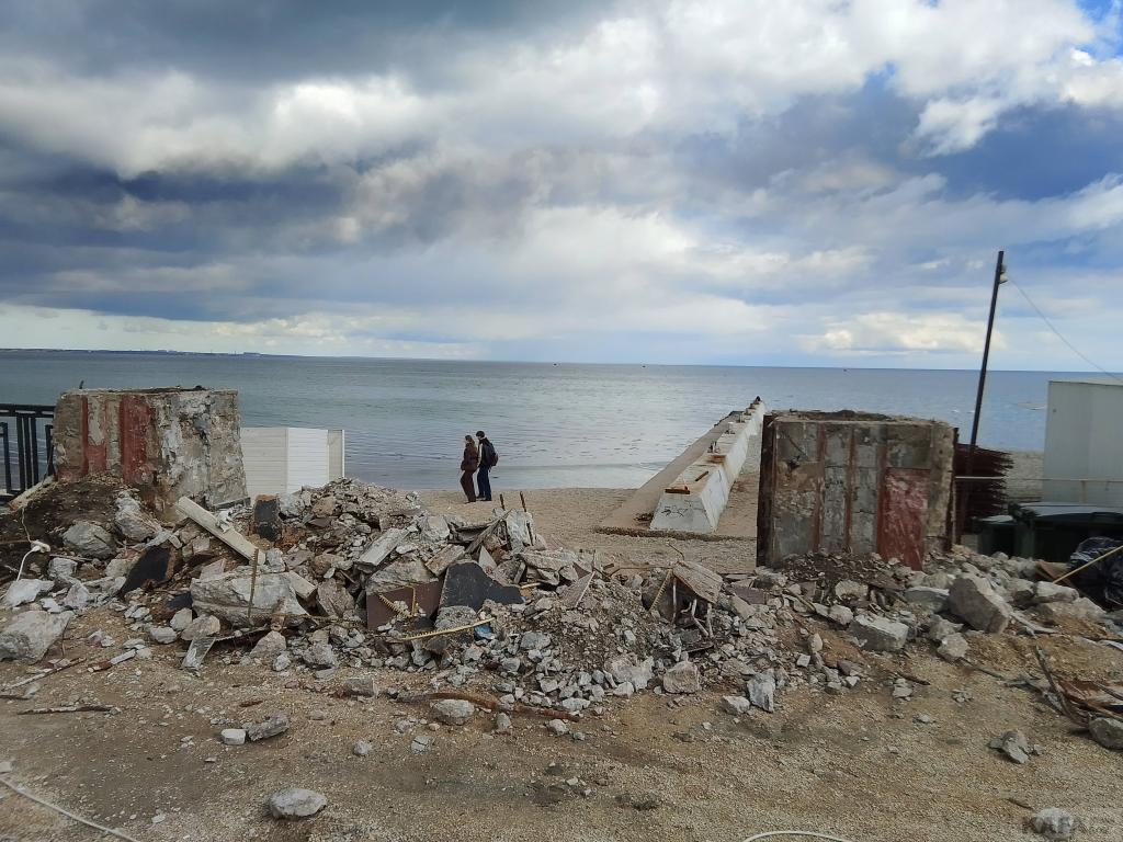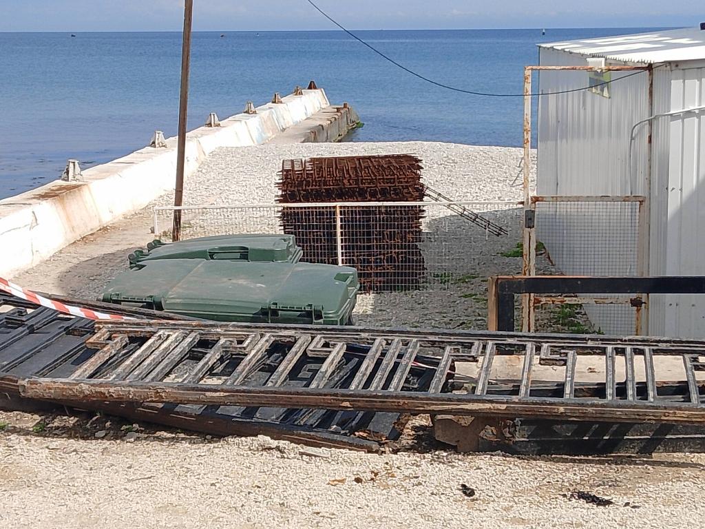 Пока идет только демонтаж: плитку теперь снимают и у зеленой зоны. Фонари и навесы все сняты и вывезены, скамеек нет, фонтаны разобраны. Сейчас роют глубокие канавы на газонах, по словам рабочих, там будут устанавливать новые бордюры. Тем самым, ширина набережной увеличится. В социальных сетях активно обсуждают, сколько же поставят кафе-магазинчиков в зеленой зоне набережной: шесть или восемь. Была информация в соцсетях же о том, что 21 апреля администрация Феодосии проведет конкурс на аренду мест под эти торговые заведения, была даже ссылка на сайт администрации, но потом эта страница с сайта пропала. Значит, нам знать и не нужно, а может, это был фейк. Снова прорыли слив у ливневки, - она после дождей размахнулась водой и запахом. Много мусора, как на набережной (что понятно, стройка же идет), так и на пляже, его периодически убирают. Зато в кафе "Веранда" музыка играет, - этим все ни по чем. Напомним, по на паспорте объекта, установленном на входе на набережную, указан срок завершения работ 1.09.2026, но администрация Феодосии рассчитывает, что получится к Дню города