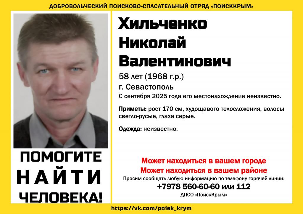 Волонтеры отряда «ПоискКрым» разместили в соцсети ориентировку: Пропал Николай Хильченко Валентинович, 58 лет (1968 г.р.), проживал в Севастополе. Родные потеряли мужчину из поля зрения несколько месяцев тому назад - с сентября 2025 года его местонахождение неизвестно. Приметы без вести пропавшего: 170 сантиметров рост, худощавый, светло-русые волосы, серые глаза. Волонтеры настоятельно просят сообщать любую информацию, связанную с поиском без вести пропавшего по телефону горячей линии добровольческого поисково-спасательного отряда «ПоискКрым»: +7 (978) 5606060. Подписывайтесь на Кафу в Facebook, страницу ВКонтакте и группу в Одноклассниках. А также на канал Youtube и Telegram. Новости по теме